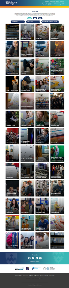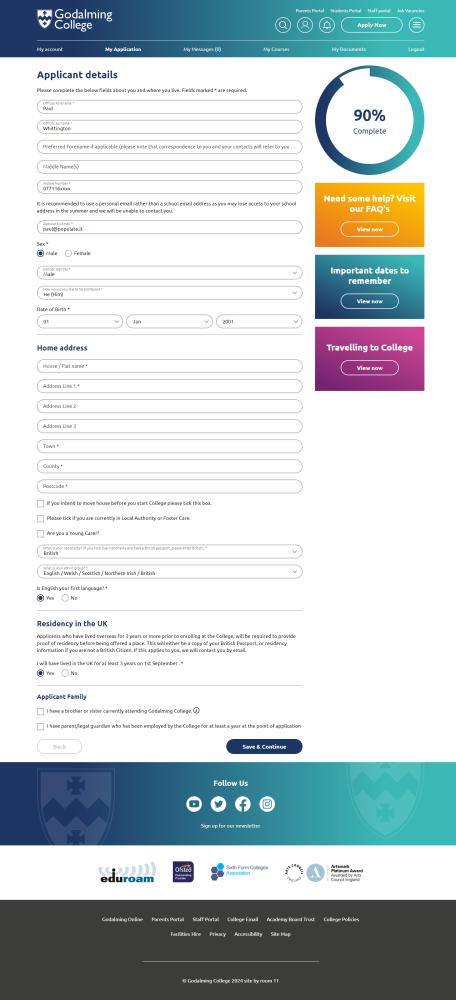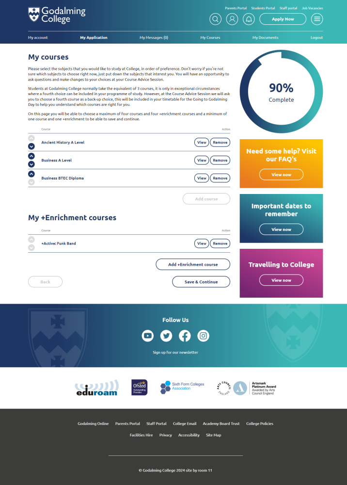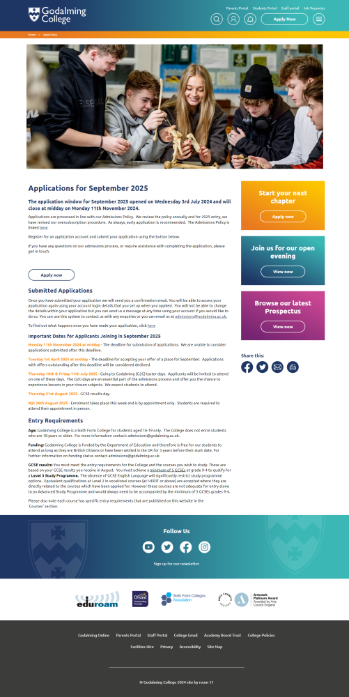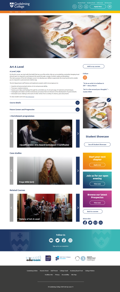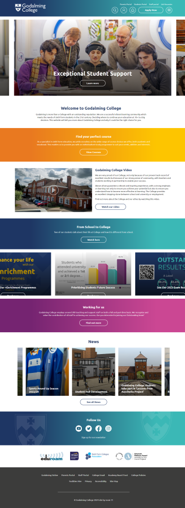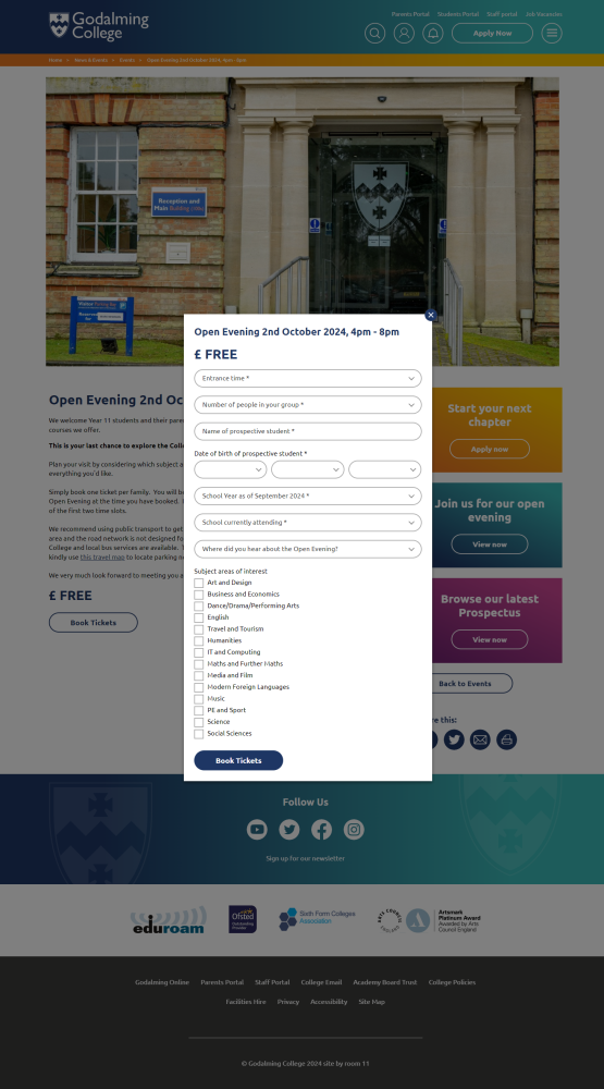 A brochure website for a local college featuring an application portal and booking system for event tickets.